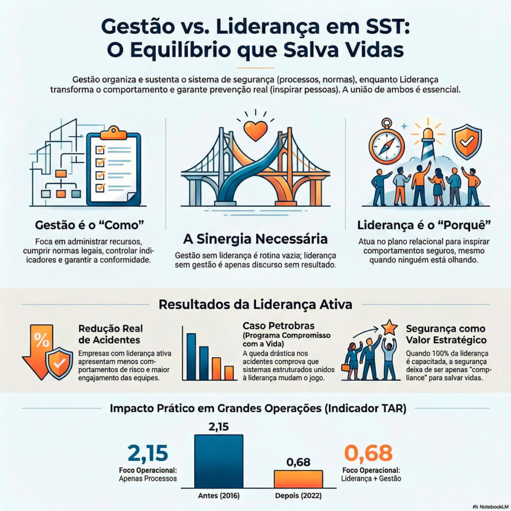 Não basta administrar bem os recursos e cumprir prazos. Em segurança do trabalho, saber liderar é o que transforma culturas e preserva vidas. Entender a diferença entre gestão e liderança é essencial — e a confusão entre esses papéis pode estar comprometendo seriamente a prevenção de acidentes na sua empresa.