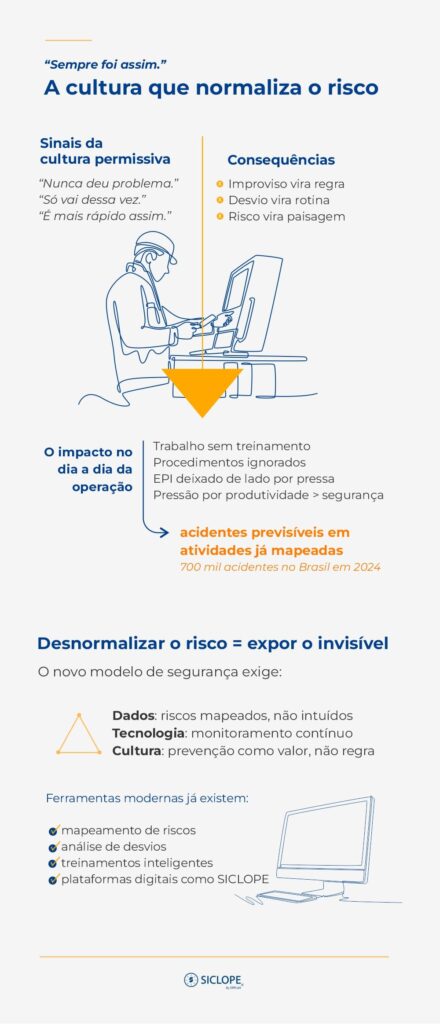 Em muitas organizações, a insegurança no trabalho não começa com um grande acidente 🚨, mas com uma cultura silenciosa de tolerância ao risco. Frases como “sempre foi assim”, “nunca deu problema” ou “só vai dessa vez” são sintomas de um comportamento institucionalizado, onde o improviso é regra, o desvio é invisível e o risco é parte natural da operação. Esse tipo de cultura, que chamamos de normalização do risco, é um dos maiores inimigos da prevenção.