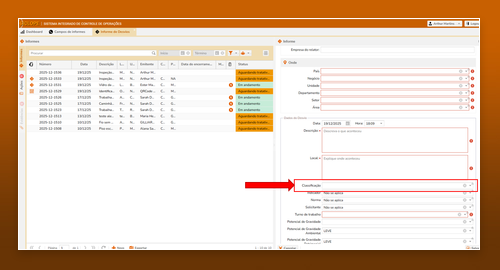 Este recurso permite que o campo ‘Classificação’ seja configurado como opcional ou não. Sendo assim, se marcado como “sim” o recurso passa a ser mandatório. Caso selecionado como “não” fica desobrigado o preenchimento. Abaixo em qual local de informes este campos terá impacto: