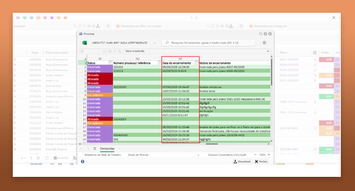 Agora é possível incluir a nova coluna no excel extraído no dashboard de partes interessadas. Ao incluir, será apresentada a data do encerramento da demanda no excel. Este é o campo o qual a coluna pega os dados