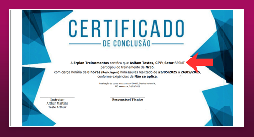 Desenvolvido recurso no módulo de Treinamentos onde seja possível apresentar no certificado o nome dos instrutores que também sejam responsáveis técnicos. Desta forma, será apresentado duas assinaturas, sendo uma delas para o papel de instrutor e outra para responsável técnico. Abaixo como fica a configuração aplicada no certificado, vejamos que a Instrutora Alana também é […]