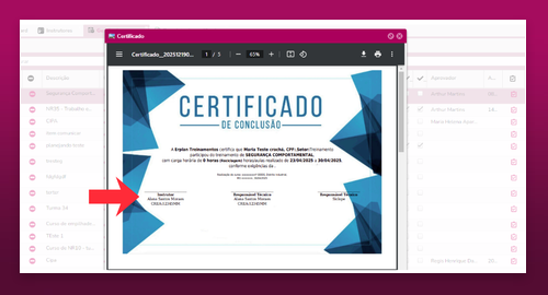 Com este novo recurso podemos inserir as informações do currículo do instrutor que ministrou o treinamento diretamente no certificado gerado para o colaborador na tela de gestão de turmas. Nota: Para esta melhoria é necessário solicitar ao suporte Siclope – [email protected]