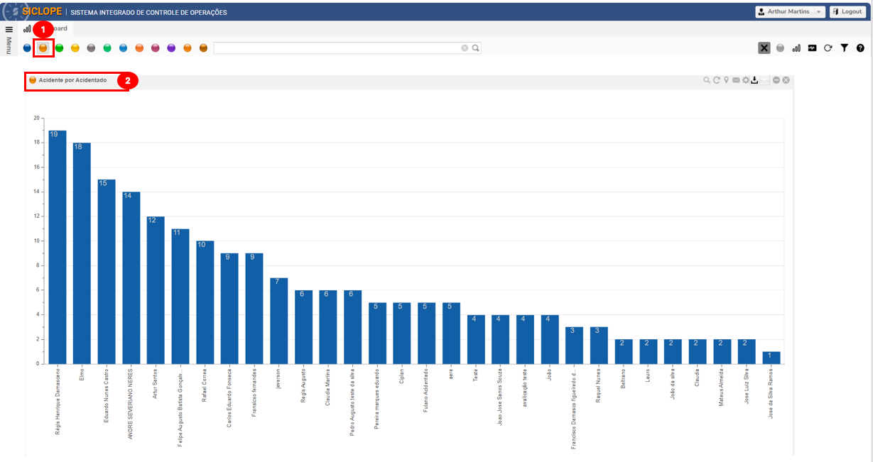 Desenvolvimento de um gráfico que permite apresentar a quantidade de ocorrências por colaborador acidentado. Essas informações são provenientes de eventos cadastrados no módulo de ocorrências, contabilizando os registros de cada colaborador envolvido.