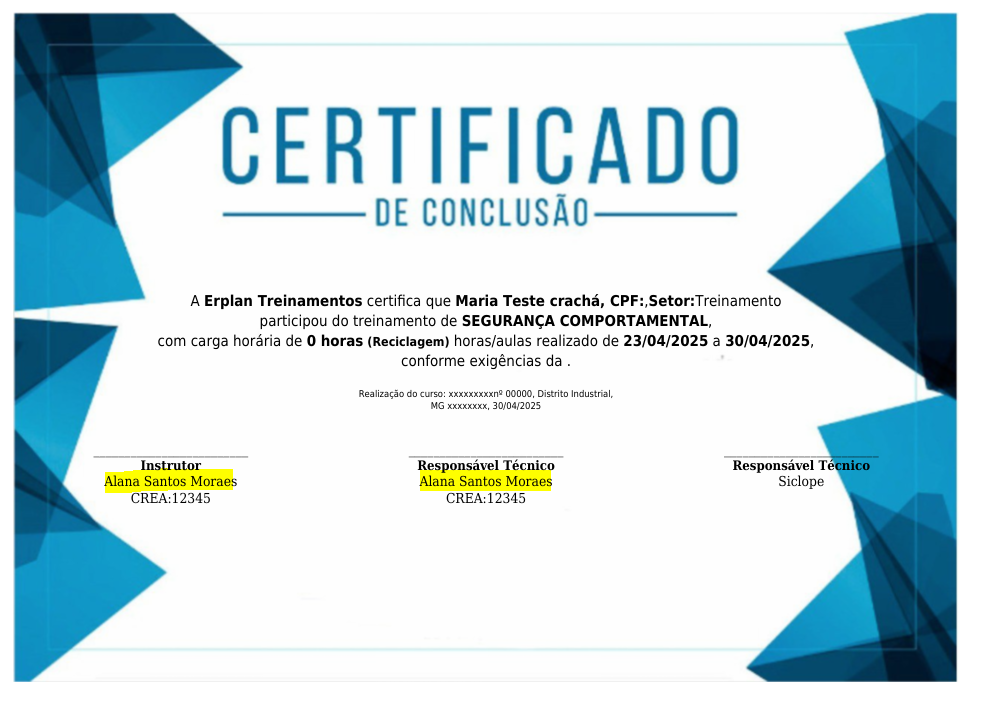 Desenvolvido recurso no módulo de Treinamentos onde seja possível apresentar no certificado o nome dos instrutores que também sejam responsáveis técnicos. Desta forma, será apresentado duas assinaturas, sendo uma delas para o papel de instrutor e outra para responsável técnico.