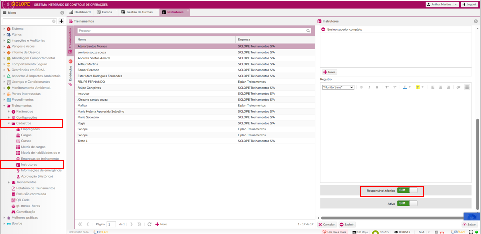 Nota importante – Define-se na tela de “Instrutores” quais usuários serão responsáveis técnicos conforme imagem abaixo: